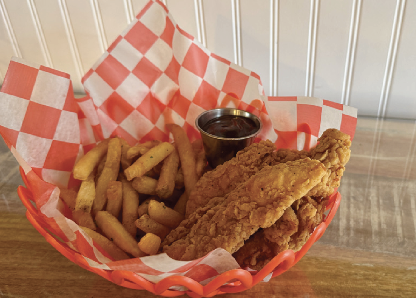Crispy chicken tenders served with fries or fruit.