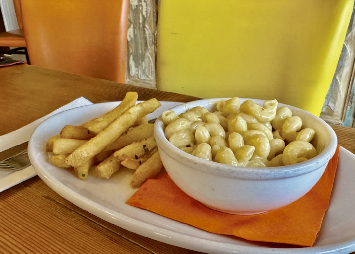 Creamy macaroni and cheese served with fries or fruit.